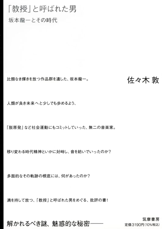 坂本の没後1年を経て発売される本書は、佐々木が「webちくま」の連載に大幅な書き下ろしを加えたもの。音楽シーンを大きく変えたYellow Magic Orchestra(YMO)の一員として活躍する以前、「教授」と呼ばれるようになる前の少年時代から、「脱原発」など社会運動へのコミット、そして生前のラストアルバム「12」のリリースまで、坂本の多面的な軌跡を追った1冊となっている。