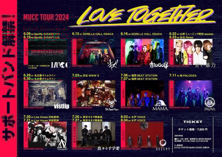 先日、徳間ジャパンコミュニケーションズとの契約を発表し、3度目のメジャーデビューが決定したMUCC。彼らが6月9日の“ムックの日”から行うツアー「MUCC TOUR 2024『Love Together』」のサポートバンドを発表した。