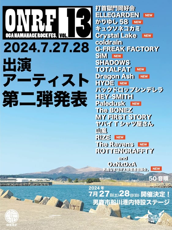 2010年に野外フェス形式で初開催され、今回で13度目を迎える「OGA NAMAHAGE ROCK FESTIVAL」。出演アーティスト第2弾としてOxNxDxA~男鹿なまはげ太鼓推進協議会。、ELLEGARDEN、かりゆし58、Crystal Lake、SiM、TOTALFAT、Dragon Ash、HYDE、Paledusk、RIZE、The Ravensの11組がラインナップされた。各プレイガイドでは入場券、駐車券が販売されている。