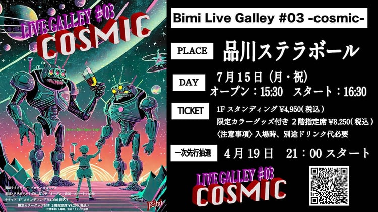 「Bimi Live Galley #03 -cosmic-」はBimiが昨年12月より開催しているライブシリーズ「Live Galley」の第3弾。Bimiにとって最大規模のワンマンライブとなり、サブタイトルの「cosmic」になぞらえて“宇宙的”な演出が繰り広げられる。ローソンチケットでは4月22日までチケットの先行予約を受付中。