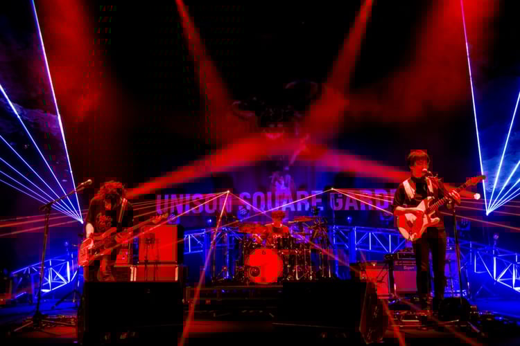 アルバムジャケットをあしらったバックドロップを背負った3人は「サイレンインザスパイ」「オリオンをなぞる」とアッパーチューンを連投し、場内の熱気を急上昇させていく。「サイレンインザスパイ」での斎藤の「こんばんは東京!」という叫びには怒号のような歓声が沸き起こった。MCで斎藤は「スタッフも気合い入ってるのか、いつもより照明がまぶしい気がするんだよね(笑)。でもスタッフも含めてUNISON SQUARE GARDENですので、バチバチに決めていこうと思います」と意気込んだ。