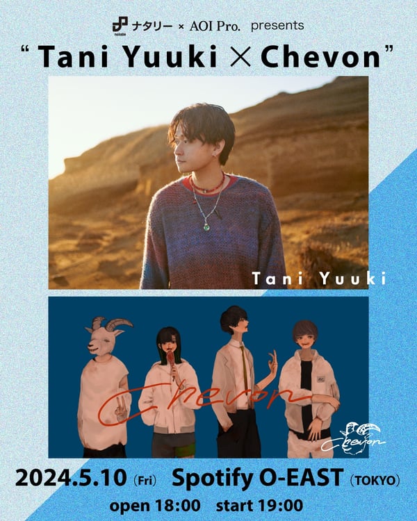 5月10日に東京・Spotify O-EASTで開催されるイベント「ナタリー×AOI Pro. presents “Tani Yuuki × Chevon”」にて、Tani YuukiとChevonのコラボパフォーマンスおよびお互いの楽曲のカバーが披露されることが決定した。
