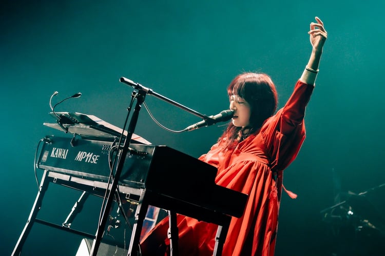 ミラーボールが照らす幻想的な雰囲気のステージにて、まずはバンドメンバーの御供信弘(B)、伊藤大地(Dr)、ひぐちけい(G)が演奏を始める。真っ赤なドレスを身に着け、笑顔で登場したヒグチはキーボードの前に腰掛けると、最新アルバムより「祈り」を演奏。ライブがスタートした高揚感をにじませながら、伸びやかで芯のある歌声を響かせた。