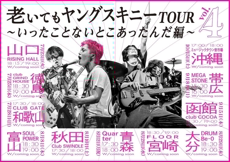 ヤングスキニーの対バンツアー「“老いてもヤングスキニーツアー vol.4” いったことないとこあったんだ編」が7月から10月にかけて開催される。