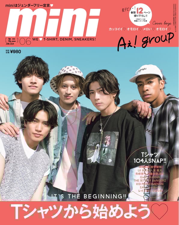 5月15日に1stシングル「《A》BEGINNING」でデビューを果たすAぇ! group。「mini」6月号のメインテーマは「IT’S THE BEGINNING!! Tシャツから始めよう♡」で、雲1つない青空の下、メンバーそれぞれが個性に合ったTシャツを着こなしている。誌面の「Tシャツ104人SNAP!!」コーナーには宮世琉弥、Girls2、BUDDiiS、THE JET BOY BANGERZ、KID PHENOMENON、Aぇ! groupの先輩である室龍太、後輩のLil かんさいなどが登場する。