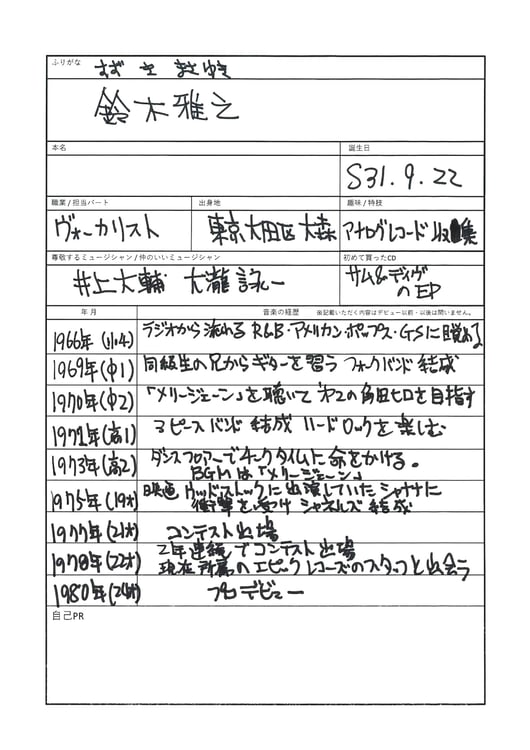 ファッションもブレザーでそろえたり、コンポラのスーツを作ったり。そういう大人のマナーも踊り場が全部教えてくれたよ。高校の学生服も吊るしじゃなく仕立ててた。上着はいわゆる中ランといって普通よりちょっと長い丈で、ズボンは腿の太さ33cmぐらい。横浜銀蝿系のものすごく太いドカンとか、「ビー・バップ・ハイスクール」の短ランは我々よりあとの世代。短ランなんて僕たちにはありえなかったからね。大森の近くの鵜の木って町に特注で作ってくれる親父さんがいて「ダブルは何cmで」とか全部指定して。今でもスーツと衣装は全部仕立ててるよ。好みのブランドがあっても、やっぱり自分に一番フィットするのはオーダーメイド。そうやって学生時代から音も服も上手に着こなそうとしてたね。