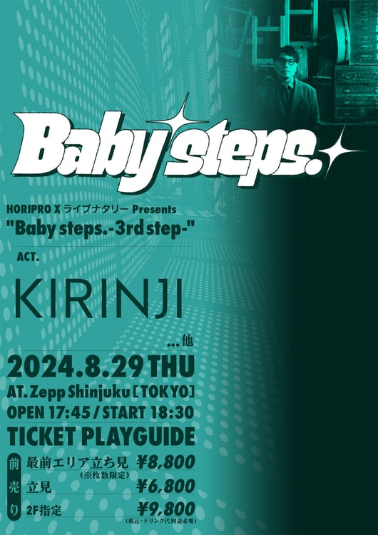 「Baby steps.」は「音楽ファンがさまざまなアーティストと出会うきっかけの場所となり、それぞれの人生のBaby steps.となりますように」という願いが込められたイベント。第3回となる今回はKIRINJIが堀込高樹(Vo, G)、小田朋美(Syn, Vo / CRCK/LCKS)、シンリズム(G, Cho)、千ヶ崎学(B)、伊吹文裕(Dr)、宮川純(Key)によるバンド編成で出演することが決定しており、後日発表される出演者とツーマンライブを繰り広げる。