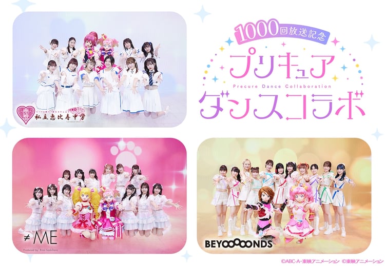ABCテレビ・テレビ朝日系の8:30の枠で放送がスタートしてから6月2日にシリーズ通算放送1000回を迎える「プリキュア」。これを記念したコラボダンス企画の第1弾では私立恵比寿中学が「わんだふるぷりきゅあ!」オープニング主題歌「わんだふるぷりきゅあ!evolution!!」、第2弾ではBEYOOOOONDSが「ふたりはプリキュア」エンディング主題歌「ゲッチュウ!らぶらぶぅ?!」、第3弾では≠MEが「フレッシュプリキュア!」前期エンディング主題歌「You make me happy!」、第4弾では私立恵比寿中学が「ハピネスチャージプリキュア!」前期エンディング主題歌「プリキュア・メモリ」、第5弾ではBEYOOOOONDSが「スター☆トゥインクルプリキュア」前期エンディング主題歌「パペピプ☆ロマンチック」、第6弾では≠MEが「わんだふるぷりきゅあ!」前期エンディング主題歌「FUN☆FUN☆わんだふる DAYS!」をそれぞれパフォーマンスする。