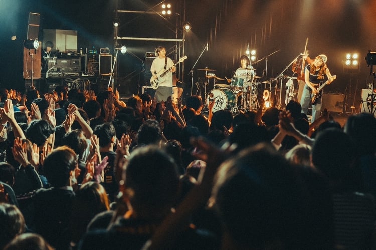 yonigeの2人とサポートメンバーのホリエマム(Dr)、土器大洋(G)がステージに現れると「Super Express」のギターが高らかに鳴りライブがスタート。4人はソリッドなギターサウンドとヘビーなビートで満員のフロアを揺らしていく。その後yonigeは「リボルバー」「顔で虫が死ぬ」を続け、ハードなロックサウンドで観客の体を突き動かした。牛丸ありさ(Vo, G)が「前回のLIQUIDROOMは1年半前だったんですけど、そのときと見えてる景色が全然違います。皆さん来てくれてありがとうございます」と心境を語り、4人は「ワンルーム」「DRIVE」「Exorcist」を連続でパフォーマンス。「Exorcist」ではステージがグリーンの光に包まれる中、牛丸が気怠げに言葉を紡ぎ、独特の緊迫感を醸し出した。さらに「バッドエンド週末」では真っ赤な照明が激しく瞬くのと合わせて轟音がかき鳴らされ、その鮮烈な光景に観客の視線は釘付けになった。