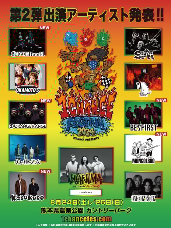 8月24、25日に熊本・熊本県農業公園カントリーパークで開催されるWANIMA主催の音楽フェス「WANIMA presents 1CHANCE FESTIVAL 2024」の出演アーティスト第2弾が発表された。