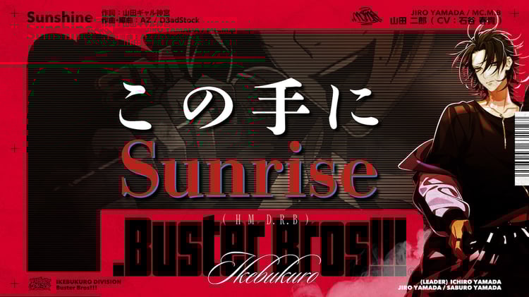 「Sunshine」は6月26日に発売されるイケブクロ・ディビジョン“Buster Bros!!!”のCD「.Buster Bros!!!」の収録曲。作詞を山田ギャル神宮、作曲・編曲をAZとD3adStockが手がけたナンバーで、疾走感あふれるギターサウンドに乗せて山田二郎がありのままの姿や思いを紡いだ1曲となっている。