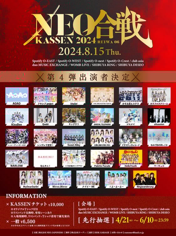 8月15日に東京・渋谷のライブハウスで開催されるNEO JAPONISMの主催サーキットフェス「NEO KASSEN2024」の出演者第4弾が発表された。