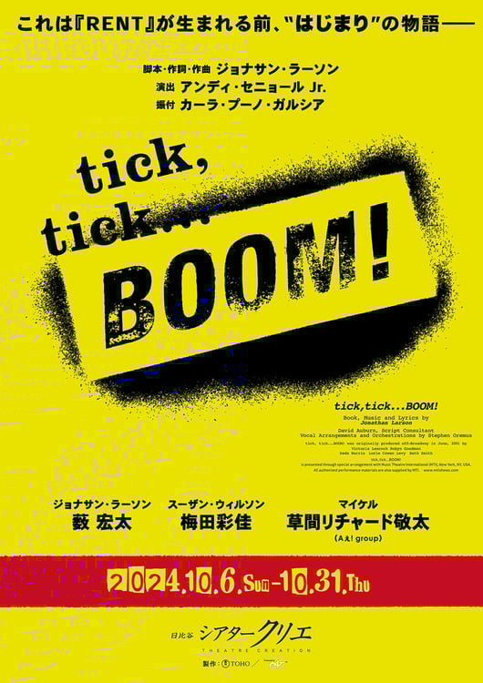 10月6日から31日まで東京・シアタークリエ、11月3、4日に愛知・東海市芸術劇場、11月7日から11日まで大阪・COOL JAPAN PARK OSAKAで上演されるミュージカル「tick, tick...BOOM!」に、薮宏太(Hey! Say! JUMP)と草間リチャード敬太(Aぇ! group)が出演する。