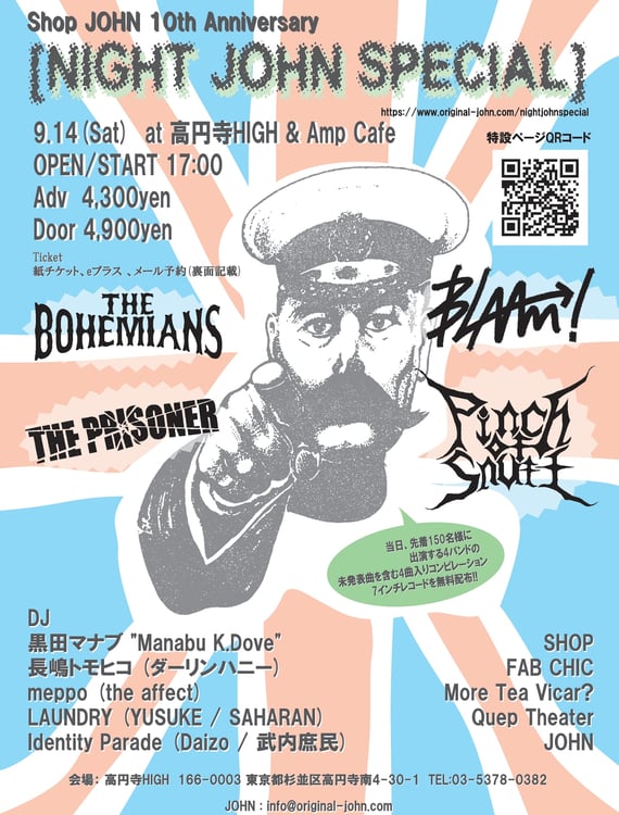 イベントにはライブアクトとしてTHE BOHEMIANS、THE PRISONER、Pinch of Snuff、BLAAM!、DJとして黒田マナブ“K.Dove”、長嶋トモヒコ(ダーリンハニー)、meppo(the affect)、LAUNDRY(YUSUKE、SAHARAN)、Identity Parade(Daizo、武内庶民)が出演。またOriginal Johnゆかりのショップやブランドも出店する。なお当日会場にて、出演する4バンドの未発表曲を含めた7inchアナログが先着150名に無料配布される。イープラスでは本日6月30日よりチケットを販売中。