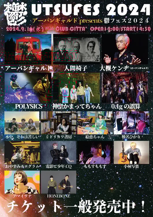 2014年にスタートした「鬱フェス」は、“心に闇を抱える、心の闇を表現する”アーティストを中心としたラインナップの屋内型フェス。このたび新たにPOLYSICS、ももすももす、小林写楽、アマイワナ、HONEBONEが出演者としてラインアップされた。