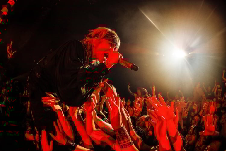 L'Arc-en-Cielのアリーナツアー「ARENA TOUR 2024 UNDERGROUND」を終えるとすぐに複数の春フェスに出演するなど、ソロツアー前からすでにライブモードに突入していたHYDE。「Here's HYDE」と不敵に笑うとステージを隅から隅まで縦横無尽に練り歩き、絶唱とアジテーションを繰り広げてオーディエンスの熱気をどこまでも引き上げる。これを受けてフロアにはクラウドサーファーが多数発生し、2階席では“BEAUTY”こと女性客たちがその様子をスマホに記録する。そんな光景を前にHYDEはうれしそうに笑い、幾度となく熱狂の坩堝と化したフロアに飛び込み、“BEAST”こと男性客に支えられながらグロウルをさく裂させる。そして、底なしに盛り上がる会場を見渡しながら、「今日はソールドアウトです。チケット余るからやめとけって声もあったけど、あきらめたらそこで終わりなんだよな。やってやったぜ」と胸を張った。