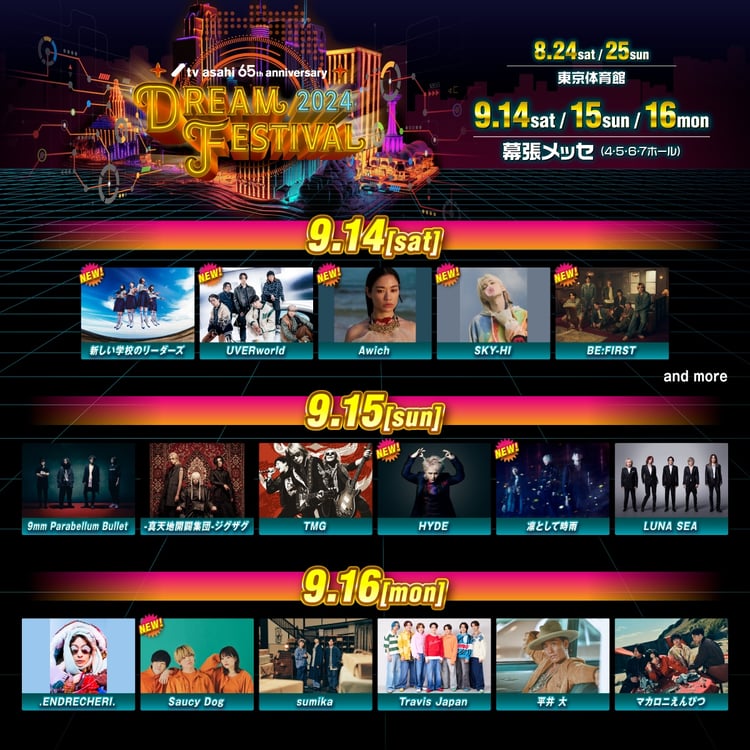 このたびアナウンスされたのは幕張メッセ会場の9月14日に出演する新しい学校のリーダーズ、UVERworld、Awich、SKY-HI、BE:FIRST、15日に出演するHYDE、凛として時雨、16日に出演するSaucy Dogの計8組。なお出演アーティストは今後も追加される予定だ。