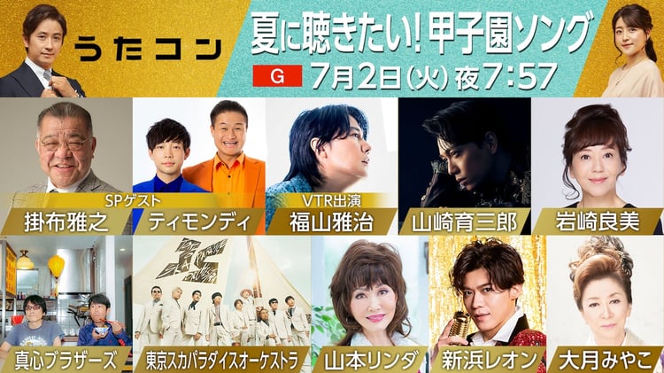 今回の「うたコン」では、今年で開場100周年を迎える甲子園球場にゆかりのある歌を特集。山崎は「栄冠は君に輝く」、東京スカパラダイスオーケストラは「スカパラ甲子園SPメドレー」、大月は「恋人のように…」、新浜は「全てあげよう」、真心ブラザーズは「ENDLESS SUMMER NUDE」「どかーん」を届ける。また岩崎は天理高等学校バトントワリング部とともに「タッチ」、新浜は天理高等学校バトントワリング部とともに「男の勲章」、山本は大阪桐蔭高等学校吹奏楽部とともに「狙いうち -甲子園ブラバンSP-」と、それぞれコラボパフォーマンスを披露。ゲストとして“ミスタータイガース”こと掛布雅之と、元高校球児として知られるお笑いコンビ・ティモンディも登場。福山雅治もVTR出演する。出演者有志による「六甲おろし」もお見逃しなく。