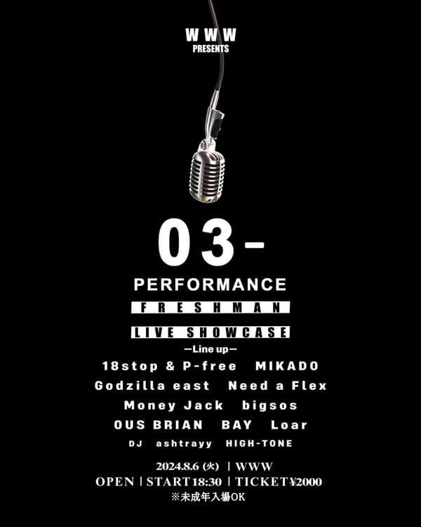 Watson、Bene Baby、炒炒、JAKENといったラッパーを輩出したYouTubeチャンネル「03- Performance」によるライブショーケースが8月6日に東京・WWWで開催される。