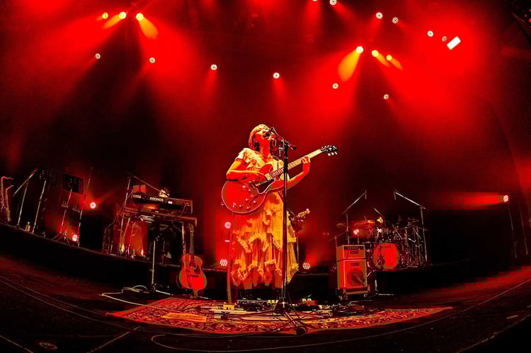 アナウンスが終わると暗転し、バンドメンバーの森光奏太(B / dawgss) 、松浦千昇(Dr)、半田彬倫(Key)に続いて、白いフリルのドレスを着た竹内が登場。1曲目「ALRIGHT」でカッティングギターを鳴らしながら、たおやかな歌声を響かせる。その後、勢いを加速させるように「BREAK MY CASE」「Free! Free! Free!」をドロップし、エネルギーに満ちたアンサンブルを放った。