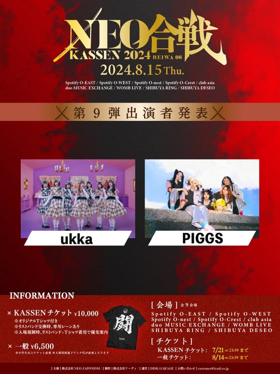8月15日に東京・渋谷のライブハウスで開催されるNEO JAPONISMの主催サーキットフェス「NEO KASSEN2024」の出演者第9弾が発表された。