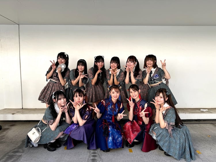 Sharply # × Flutter ♭のパフォーマンスが終了すると、「かわちぃ~」と感想を言いながらTEAM SHACHIが再びステージへ。そして秋本の「かわいく撮ってくださいね」というひと言を経て、2組によるコラボパートへと突入した。総勢11名で最初に披露されたのはTEAM SHACHI「のんあるすいけん feat. 炒飯」。中華料理のメニュー名や中国語風のフレーズ、「ねえねえ聞いて」「酔っちゃった~」という決めゼリフなど遊び心満載なこの曲は8月7日リリースのEP「待ち合わせに、飽きもと。」に収録される最新曲だ。すでにこのフリーライブツアーでコラボバージョンが披露されていたこともあり、2組のパフォーマンスは息ぴったり。さらにSharply # × Flutter ♭の楽曲「トクント君」へと続き、盛大なクラップが響き渡った。