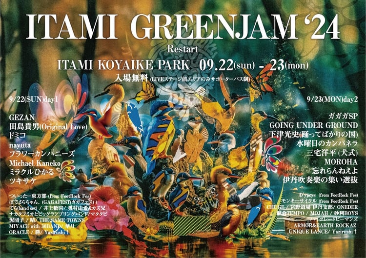 9月22、23日に兵庫・伊丹市昆陽池公園で行われる入場無料の野外音楽フェス「ITAMI GREENJAM'24」の出演アーティスト第3弾が発表された。