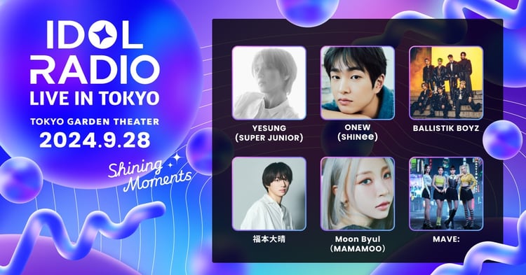 音楽イベント「IDOL RADIO LIVE IN TOKYO~Shining Moments~」が9月28日に東京・東京ガーデンシアターにて開催されることが決定。第1弾ラインナップとして、オンユ(SHINee)、福本大晴(ex. Aぇ! group)、イェソン(SUPER JUNIOR)、BALLISTIK BOYZ、ムンビョル(MAMAMOO)、そして韓国のバーチャルガールズグループ・MAVE:の出演が発表された。