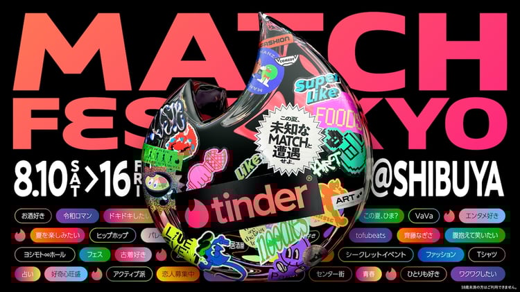 Tinder Japanが協賛するフェス「MATCH FES TOKYO」が8月10日から16日までの7日間に東京・渋谷エリアで開催される。このフェスのテーマソング「交差点」をtofubeats、VaVa、高比良くるま(令和ロマン)が制作。YouTubeではテーマソングが流れるコンセプトムービーが公開された。