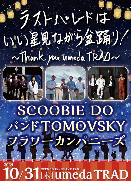 10月31日をもって閉館する大阪のライブハウス・umeda TRADの最終公演が、SCOOBIE DO、TOMOVSKY、フラワーカンパニーズのスリーマンライブに決定した。