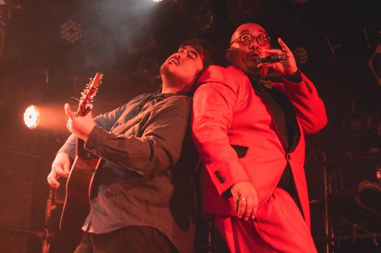 2人の思惑通りに鳴り続ける拍手を受けて、澤部と街裏はステージに登場。彼らはこの日初めて観客に語りかけ、街裏が「皆さんに早く語りかけたかったんですけどね。そういう機会のないライブやから」と笑った。澤部は「今年の年明けくらいに、あるイベントでPUNPEEさんが『ODDTAXI』をやったときに、偽スカートとして空気階段の鈴木もぐらさんが出るっていうのがあったんですよ。PUNPEEさんが僕のパートを歌って、鈴木もぐらさんが自作のラップを披露して大盛り上がりみたいな感じだったんです(笑)」と語り、「僕はラップは書けないんですけど、こちらに……」と街裏を示す。街裏は「名古屋と大阪、どっちもミスってるんですよね……」と緊張をにじませながら背水の陣でパフォーマンスへ。澤部が伸びのある歌声を響かせる横で、街裏が見事ノーミスでラップを繰り出し、ツーマンツアーは輝かしいエンディングを迎えた。