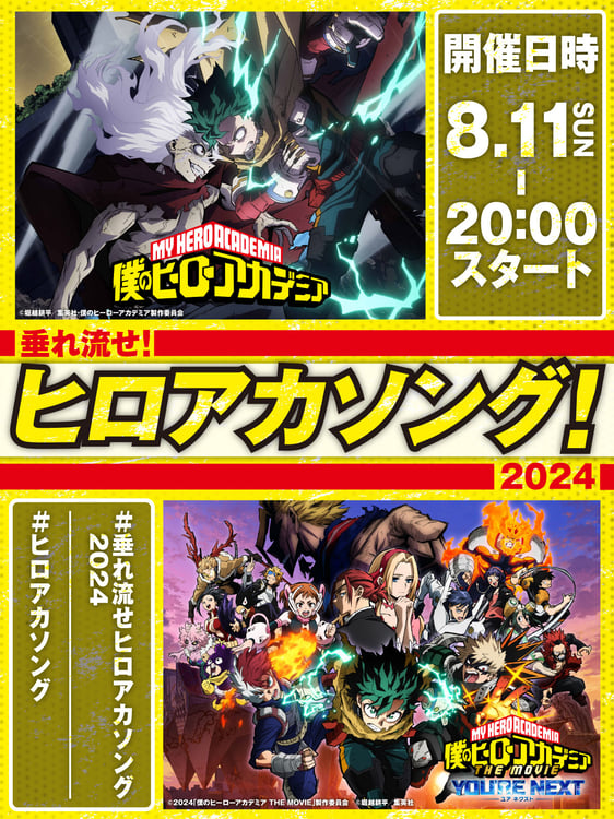 アニメ「僕のヒーローアカデミア」の歴代オープニングテーマ、エンディングテーマを集めたプレイリストを使ったオンラインリスニングパーティ「垂れ流せ! ヒロアカソング! 2024」が、8月11日20:00より開催されることが決定した。