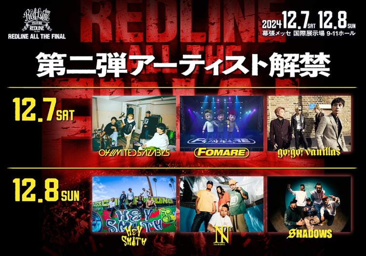 「REDLINE」は2010年に初開催されたライブシリーズ。初回から14年が経った今年2024年、本シリーズの歴史に幕が下ろされる。このたび12月7日に04 Limited Sazabys、FOMARE、go!go!vanillas、8日にHEY-SMITH、The BONEZ、SHADOWSがラインナップされた。今後も出演アーティストは追加される。チケットぴあでは9月1日23:59まで、チケットのオフィシャル2次先行予約を受付中。