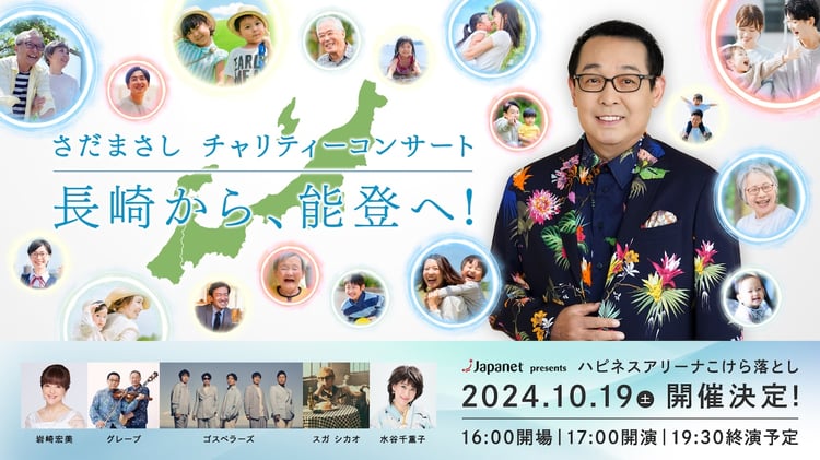 さだまさしによるチャリティコンサート「Japanet presents ハピネスアリーナこけら落とし さだまさしチャリティーコンサート 長崎から、能登へ!」が、10月14日に開業する長崎スタジアムシティの多目的アリーナ・HAPPINESS ARENAのこけら落とし公演として開催される。