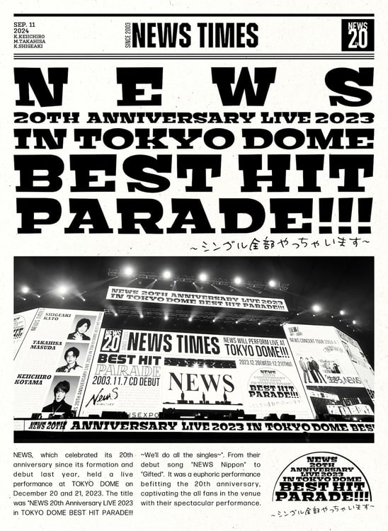 NEWSが9月11日にライブBlu-ray / DVD「NEWS 20th Anniversary LIVE 2023 in TOKYO DOME BEST HITPARADE!!!~シングル全部やっちゃいます~」をリリースする。この作品のジャケットデザインが公開された。