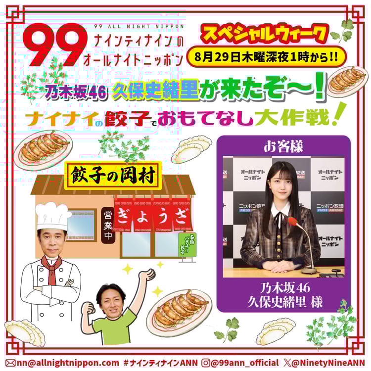 「パクチーは餃子にするのがおいしい!」という岡村はこの日、ニッポン放送の局内に「餃子の岡村」をオープン。生放送で久保と矢部浩之を客として迎え、“餃子でおもてなし大作戦”を決行をする予定だ。