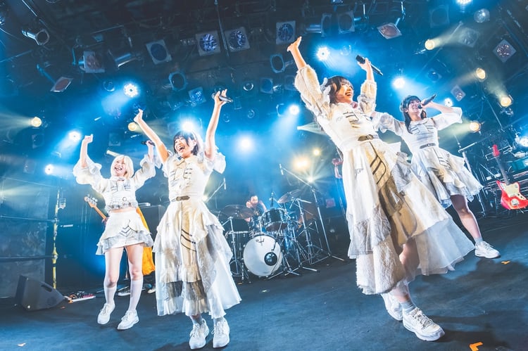 続いてdownyの青木ロビンが提供した「火曜日の雨」へ。アイドルの楽曲らしからぬ尖りっぷりの前衛的なオルタナティヴロックを、4人は見事に歌いこなす。曲の中盤にはダンサブルな四つ打ちサウンドに乗せて紬が鋭いシャウトを炸裂させる場面も。さらにRAYは「See ya!」からつなぐ形で、この日だけのリミックスが施された「フロンティア」を披露。本公演で初めてアイドル現場らしいコールがフロアから上がった。曲終わりに月海が「バンドとアイドルの壁を壊しにやってきたぜ!」と改めてイベントへの思いを語り、ライブはラストスパートへ。4人は「バタフライエフェクト」「わたし夜に泳ぐの」の2曲でシューゲイズアイドルとしての顔も見せ、歪んだギターサウンドが生む轟音の海に柔らかな歌声を浮かばせた。