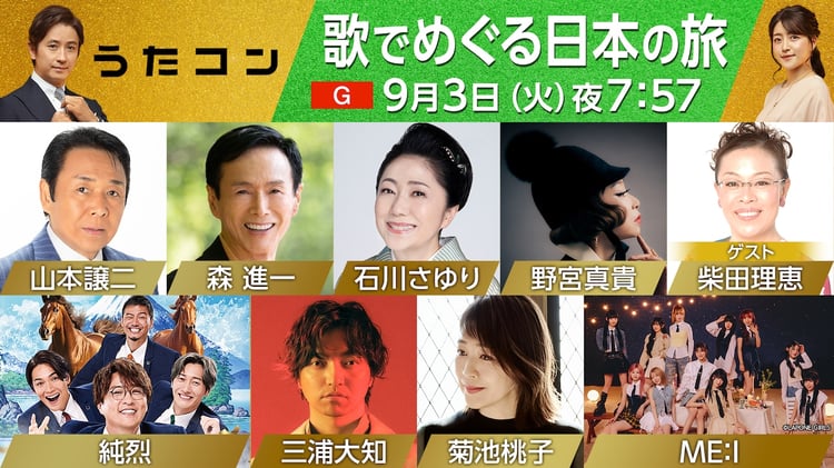 山本譲二は7年ぶりに「うたコン」に出演し、ヒット曲「みちのくひとり旅」を歌唱。今年デビュー40周年を迎えた菊池桃子はヒット曲「Say Yes!~もう逢えないかもしれない」を届ける。またME:Iは「Hi-Five」、三浦は「心拍音」、純烈は「夢みた果実」、森は「みれんの港」とそれぞれオリジナル曲も披露する。