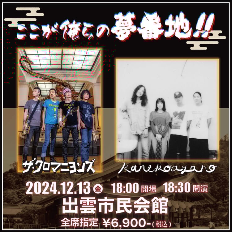 ザ・クロマニヨンズとカネコアヤノ率いるバンドkanekoayanoが出演するライブイベント「ここが俺らの夢番地!!」が12月13日に島根・出雲市民会館で開催される。