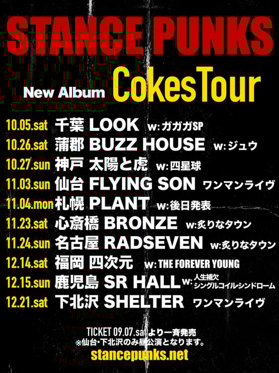 9月25日にニューアルバム「Cokes」をリリースするSTANCE PUNKS。そのレコ発ツアーではガガガSP、ジュウ、四星球、炙りなタウン、THE FOREVER YOUNG、人性補欠、シングルコイルシンドロームらを迎えてライブを行う。11月3日の宮城公演と、ファイナルの12月21日の東京公演はワンマン開催となる。11月4日の北海道・PLANT公演の対バン相手は後日発表。チケットは9月7日に一般販売される。