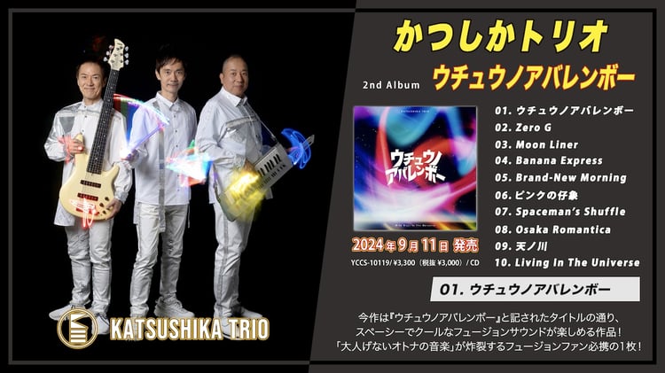 日本を代表するフュージョンバンド・カシオペアの元メンバー向谷実(Key)、櫻井哲夫(B)、神保彰(Dr)によって結成されたインストゥルメンタルバンド・かつしかトリオが、9月11日に2ndアルバム「ウチュウノアバレンボー」をリリースする。