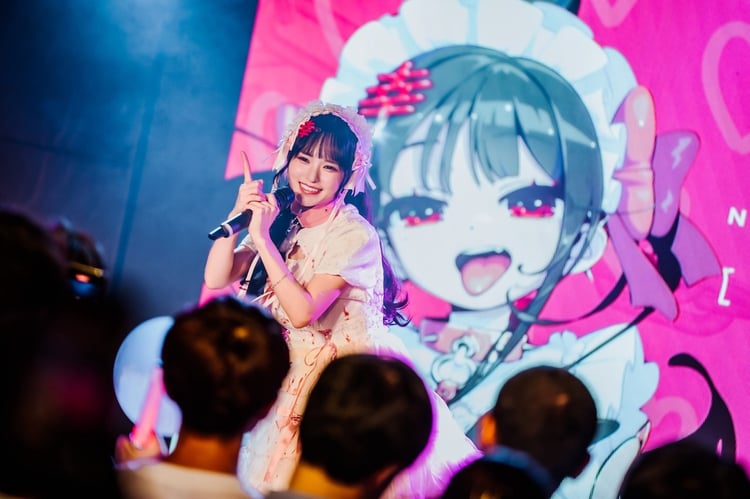 SEが鳴り響き、この日を待ちわびた来場者から大歓声とクラップが巻き起こる中、藤咲が真紅の衣装をまとって登場。TikTokで人気を集める、ソロ第1弾楽曲「鬱鬱バッキュン!」でライブをスタートさせ、その後ステージに登場した最終未来少女のメンバーとともにグループの定番曲を立て続けに披露していった。