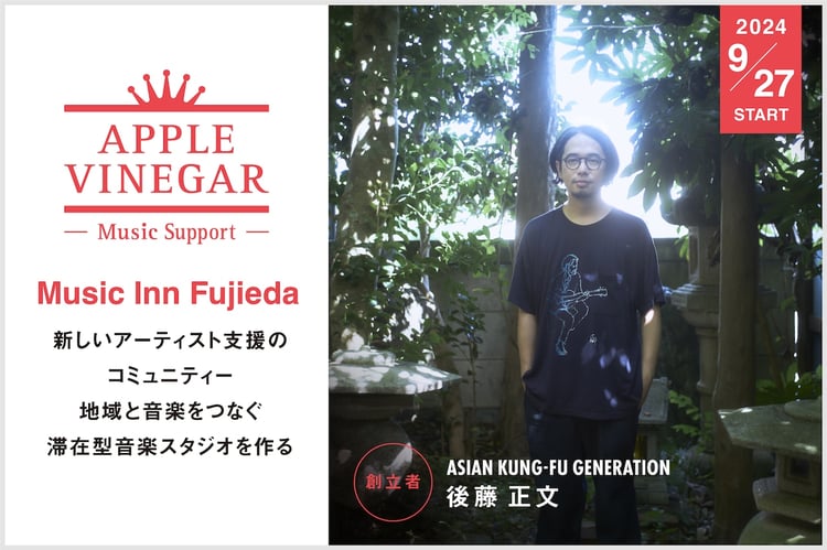 「アップルビネガー音楽支援機構」はインディペンデントに活動するミュージシャン、アーティストに対して金銭的、技術的な支援を行うべく今年5月に発足。活動総称を「APPLE VINEGAR -Music Support-」として、静岡県藤枝市内に音楽制作スタジオ「Music Inn Fujieda」を建設し、同市を拠点に活動していく。スタジオの完成は2025年秋頃を予定している。クラウドファンディングは本日から12月15日までCAMPFIREにて実施され、集まった支援金はレコーディングスタジオと宿泊施設の改修に、改修費を上回る支援が集まった場合は「Music Inn Fujieda」の運営費に充てられる。本日のインスタライブでは後藤が今回の取り組みについて、事前に寄せられた質問に答える。