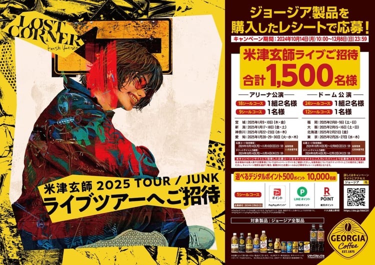 米津玄師が2025年1月から開催するライブツアー「米津玄師 2025 TOUR / JUNK」に、日本コカ・コーラ「ジョージア」製品を購入し応募した人の中から抽選で1500名が招待される。