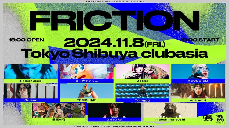 「FRICTION」はクリエイティブプロダクション・CAMBRがプロデュースするイベント。出演者第1弾として、Jinmenusagi、ピーナッツくん、Daoko、ASOBOiSM、Guiano、TEMPLIME、Tomggg × ena mori、長瀬有花、OHTORA × maeshima soshiがラインナップされた。チケットは10月16日20:00にZAIKOで発売される。