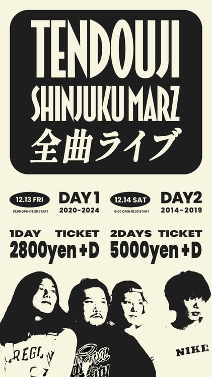 2014年に結成し、今年で10周年を迎えたTENDOUJI。彼らは12月13日公演では2020年から2024年にかけて発表した楽曲、14日公演では2014年から2019年にかけて発表した楽曲を一挙演奏する。さらに会場では過去のグッズやCDが再販される予定だ。チケットはイープラスにて販売中で、2800円の1日券、5000円の通し券の2種類から選べる。