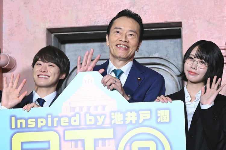 そして「話をガラッと変えますけども、9年ぶりに帰ってきた『民王R』では、新メンバーに大橋くん、あのちゃん、山時くんが加わり、3人がものすごいエネルギーを発してくれて、新しい『民王』に生まれ変わりました。前作同様、金田さん、山内さんも面白い味をいっぱいちりばめてくれてます。で、私自身なんですけども、今回いろんな人間と入れ替わると初めて聞いたとき、面白えなと思ったんですけども、思うのとやるのじゃ大違いで、いっぱいいっぱいになりながらやってます。60過ぎてこういう役をいただくっていうのは、そうそうあることじゃないので、感謝しながらやってるとこです。今日は短い時間ですけども、よろしくお願いします!」と挨拶した。