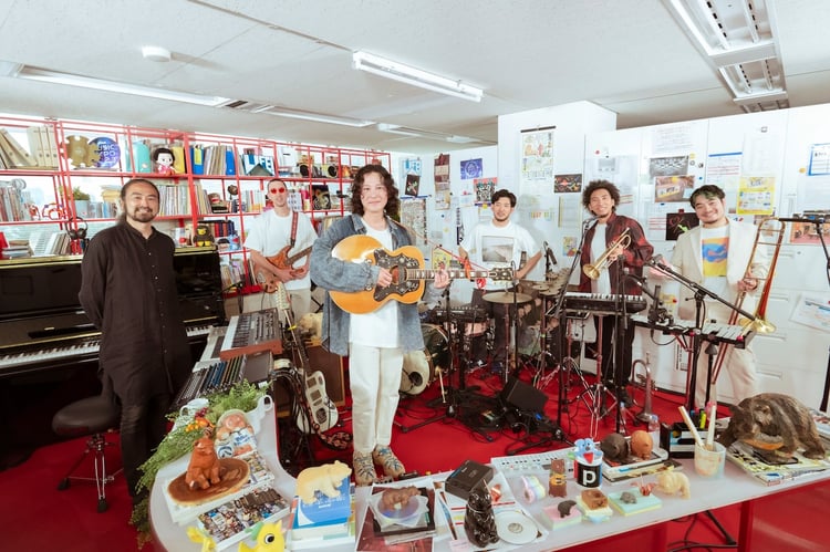 「tiny desk concerts JAPAN」はアメリカの公共放送・NPRが2008年からネットで展開している音楽コンテンツ「tiny desk concerts」の日本版。NHKのオフィスを舞台に、ゲストミュージシャンがライブパフォーマンスを繰り広げる。ROTH BART BARONは三船雅也(Vo, G)に西池達也(Pf, Key)、竹内悠馬(Tp)、大田垣正信(Tb)、ザック・クロックサル(B)、工藤明(Dr)を加えた編成で登場する。