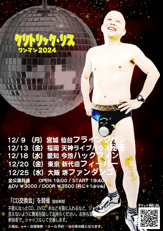 SNSから流れてくる画像や動画で「クリトリック・リスって… 苦手かも?」て思ってる人がめちゃくちゃ多い。「下ネタ?」、「半裸のおじさん客が踊ってるんでしょ?」、「最後はオアシスのカバーでしょ?」、「みんな酔っ払ってるんでしょ?」などなど。そんな事無いって! 確かにイベントやお客さんに合わせて稀にそんな日もあるけど、普段はちゃんとしてるんですよ。実際ライブを観てもらうと、「今まで避けてたけど、良かった」って言ってくれる人がほとんど。誤解してる人だらけ! ここ数年 年末のワンマンに関しては泥酔や脱衣を禁止にしてて、初めての人でも楽しくて感動を伴うライブを行ってるんで安心してください。今年もちゃんとやります、できますから。ワンマンで滑ったら終わりでしょ!?