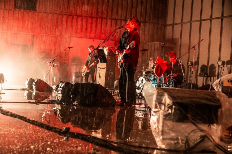 大きな拍手を浴びながらステージに登場したsyrup16gの3人は、光を背に受けながら20年前の「遅死10.10」と同じく「クロール」でライブの幕を開けた。鼓動のように力強く轟くビートと五十嵐隆(Vo, G)の切実な歌声が一瞬で雨音を掻き消していく。土砂降りの光景の中で「前頭葉」「Heaven」を絶唱する五十嵐の姿は人々の目を奪い、この日が伝説の一夜になることを予感させた。4曲目の「もういいって」を終えたところで「ありがとう。ごめんね」と五十嵐が申し訳なさそうに雨に濡れた観客に告げると、どうってことないと言わんばかりの温かな拍手が客席から沸き起こる。中畑大樹(Dr)は「散々だよね。こんなバンドを観に来たばっかりに。もうちょっと、たぶん徐々に……強くなってくると思うんだけど……」と一瞬期待を持たせつつも天気予報通りに正直に述べ、「最後まで楽しんでいってくれたら。無理なさらずにね」と観客を気遣った。